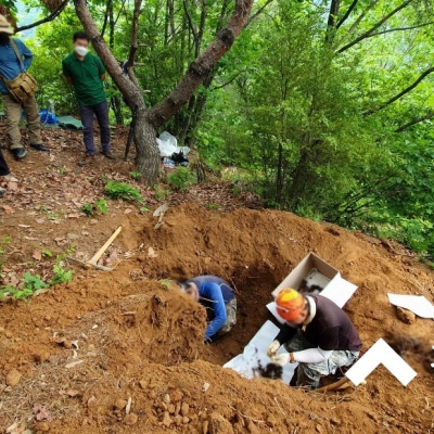 서울시립 용미리제1묘지 400구역 계곡을 건너 산 맨 위쪽에 자리잡은 매장하신지 오래된 조부님 산소를 파묘하여 화장하시기 위해 묘지개장 하여 유골을 수습해 드렸습니다. 경기도 고...